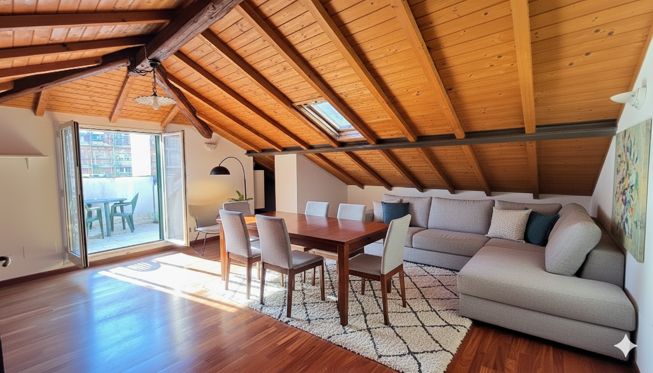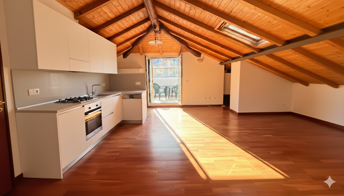 In Corso Matteotti, proponiamo in vendita un elegante attico situato all’ultimo piano di una raffinata palazzina in stile Liberty, servita da ascensore. Questa residenza combina il fascino storico con il comfort moderno, offrendo una soluzione abitativa di pregio. L’ingresso si apre su un ampio soggiorno mansardato con travi a vista, che accoglie una zona cucina a vista. Questo spazio conviviale è ulteriormente valorizzato da una terrazzina vivibile che offre una piacevole vista aperta, perfetta per momenti di relax. La zona notte è progettata per il massimo comfort. Due spaziose camere matrimoniali, una delle quali vanta una comoda cabina armadi annessa, oltre terrazza, Due bagni completi e funzionali, uno con vasca e uno con doccia. Numerosi e generosi ripostigli offrono soluzioni pratiche per l’organizzazione. Il comfort è garantito dall’aria condizionata e dal riscaldamento termoautonomo, che permettono di gestire al meglio le proprie esigenze abitative e i consumi. Il Valore Aggiunto: Box Auto Un dettaglio di notevole importanza: nell’offerta è incluso un box auto di proprietà, comodamente situato nelle vicinanze dello scalo ferroviario di Rapallo, un lusso irrinunciabile in questa zona centrale.